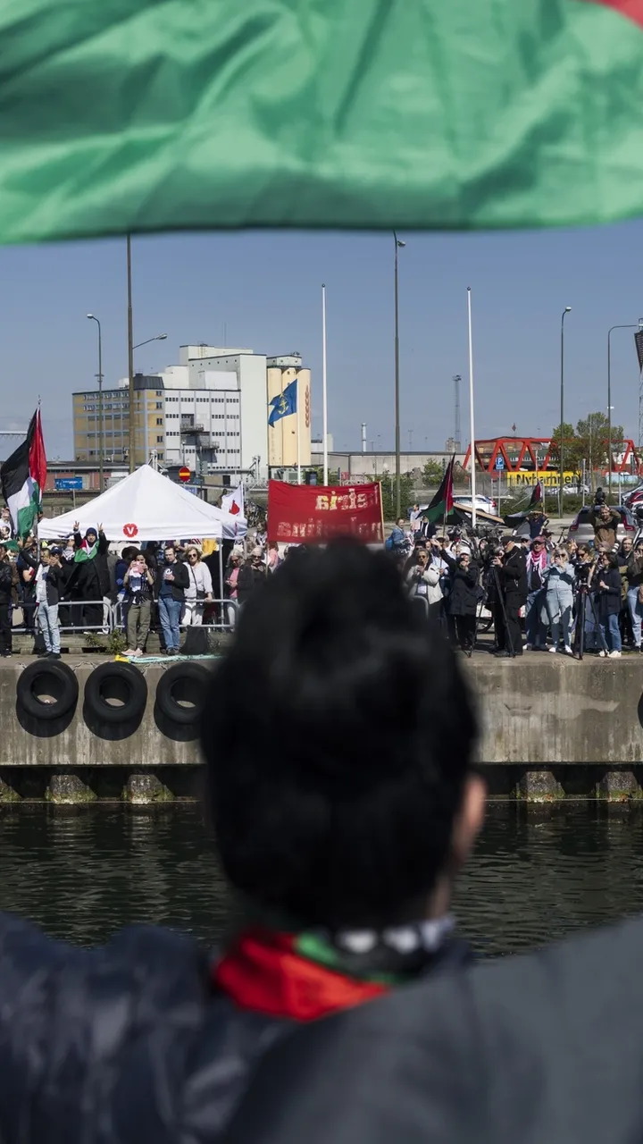 Shukran, shukran, habibi! Takk, roper Jeanette Escanilla på arabisk og vinker fra båten Handala idet den legger fra kai i Helsingborg. Skuta ble dekorert kvelden i forveien med nye malerier. Den er et fargerikt og politisk skue der den tøffer ut fra havna. Små og store palestinske flagg vaier fra master og rekkverk.