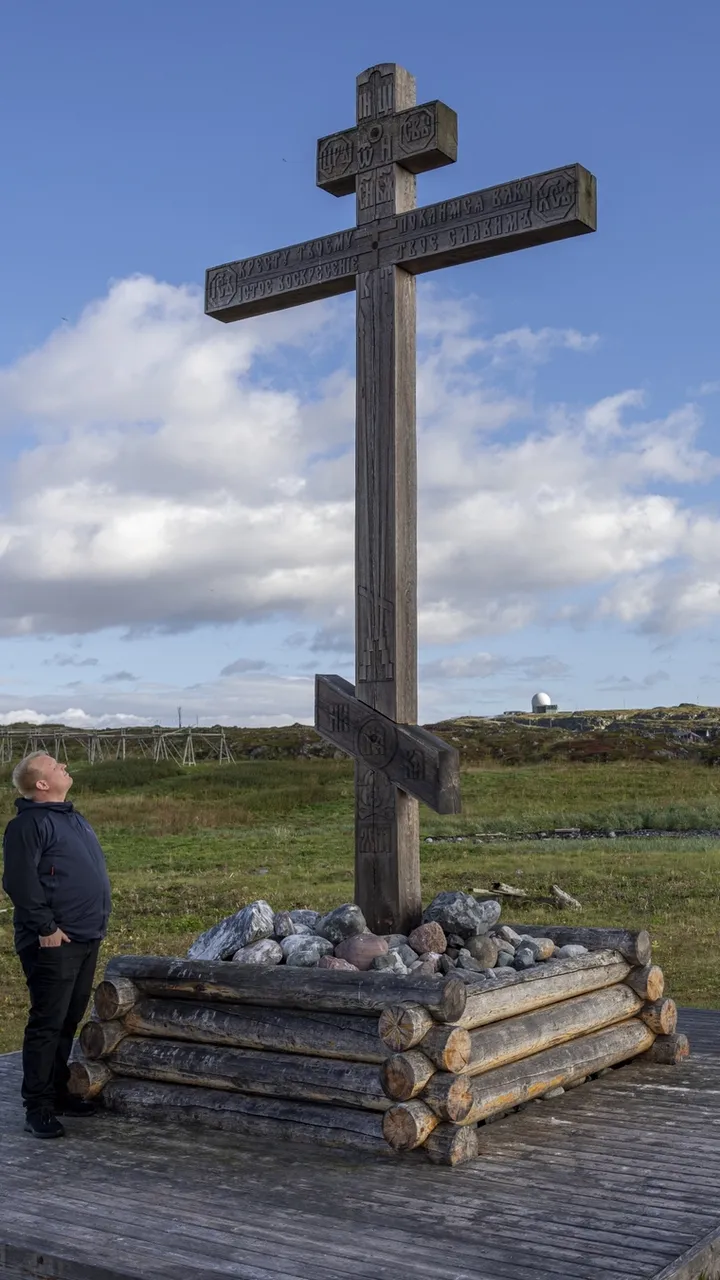 Det enorme pomorkorset ble satt opp i 2011 og er en gave fra Arkhangelsk til Vardø til minne om handelsvirksomheten og kulturutvekslingen mellom Varanger og Russland. Fra trekorset kan man se rett mot de kulerunde, hvite radarene som er så karakteristisk for Vardø-landskapet. For noen år tilbake ville russerne sette opp et russisk-ortodokst kapell i byen, men da invasjonen av Ukraina startet, la kommunen planene bort. Den russisk-ortodokse kirka er kjent for å være tett på russiske myndigheter og etterretning.