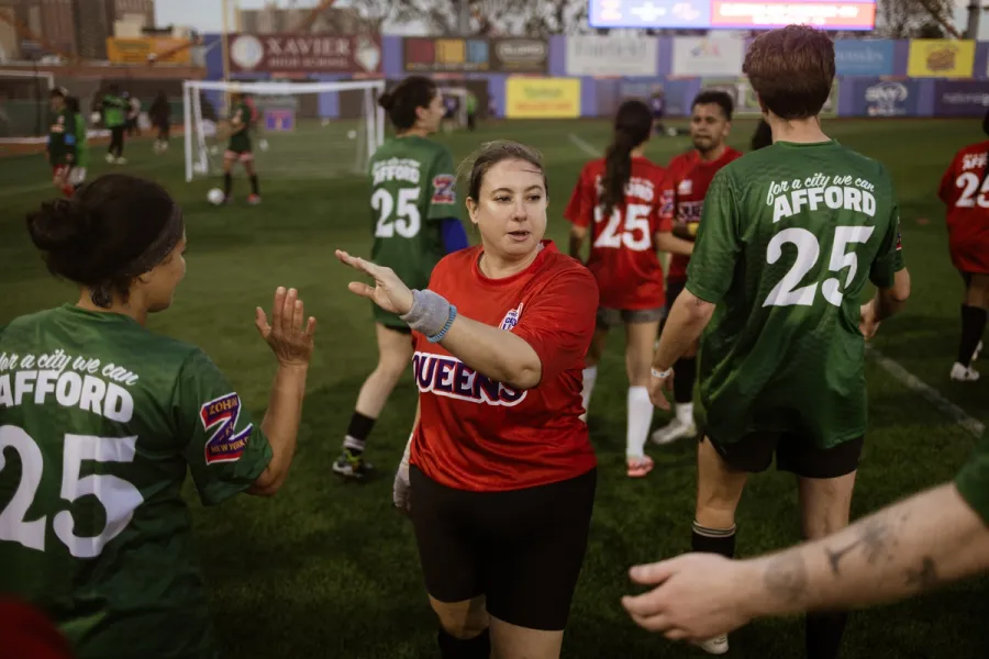 Da Mamdani kommer gående på andre sida av banen, presser vi oss høflig fram i mengden av journalister fra hele verden. Vi får høre Mamdani fortelle at fotballaget han selv pleide å spille på, var «en viktig del» av hvordan han selv kom seg gjennom uka som barn og ungdom, en kilde til samhold og glede i vanskelige tider. Men dagens fotballturnering «viser også hva politikk kan være», forklarer han: «et sted hvor folk kommer sammen», spiller på lag og finner løsninger i «den dyreste byen i Amerika».