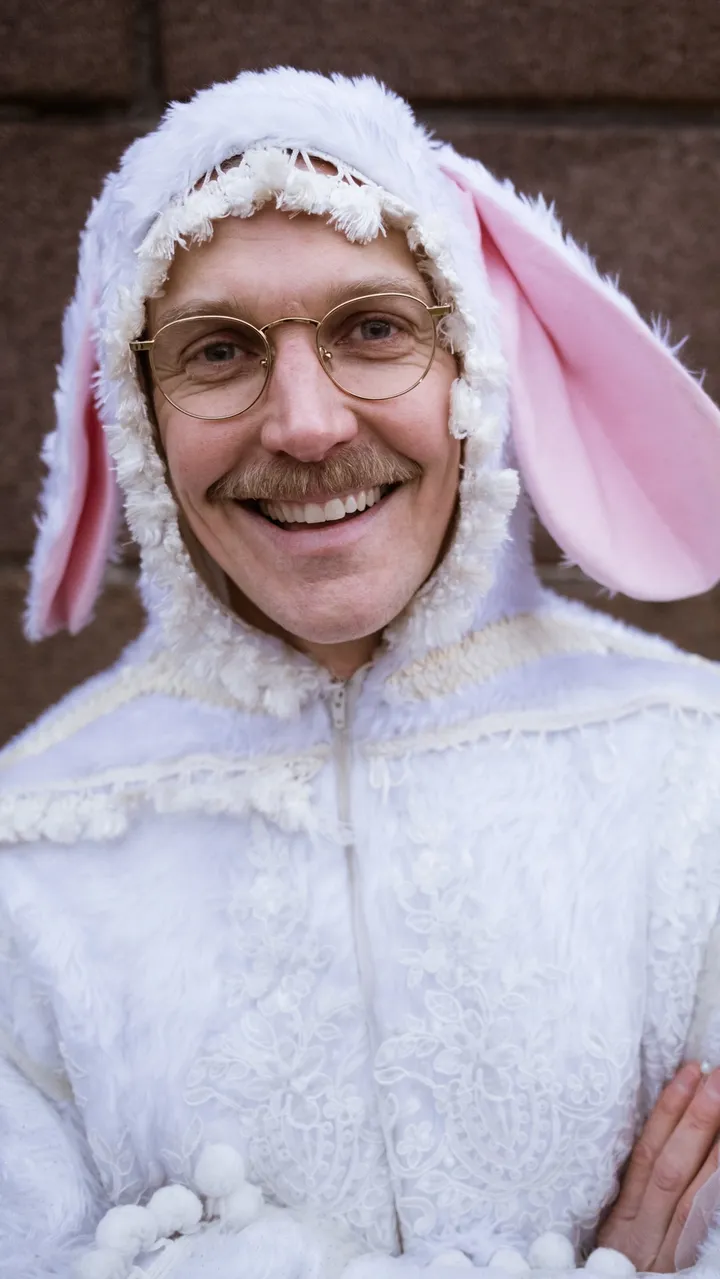 En kanin i vinterdrakt står på Eidsvolls plass tidlig en fredags morgen rett før jul. Fra en medbrakt krakk rager den knapt et hode høyere over forbipasserende. Kaninen har mange ting på hjertet. Det skjer så mye fryktelig i verden.