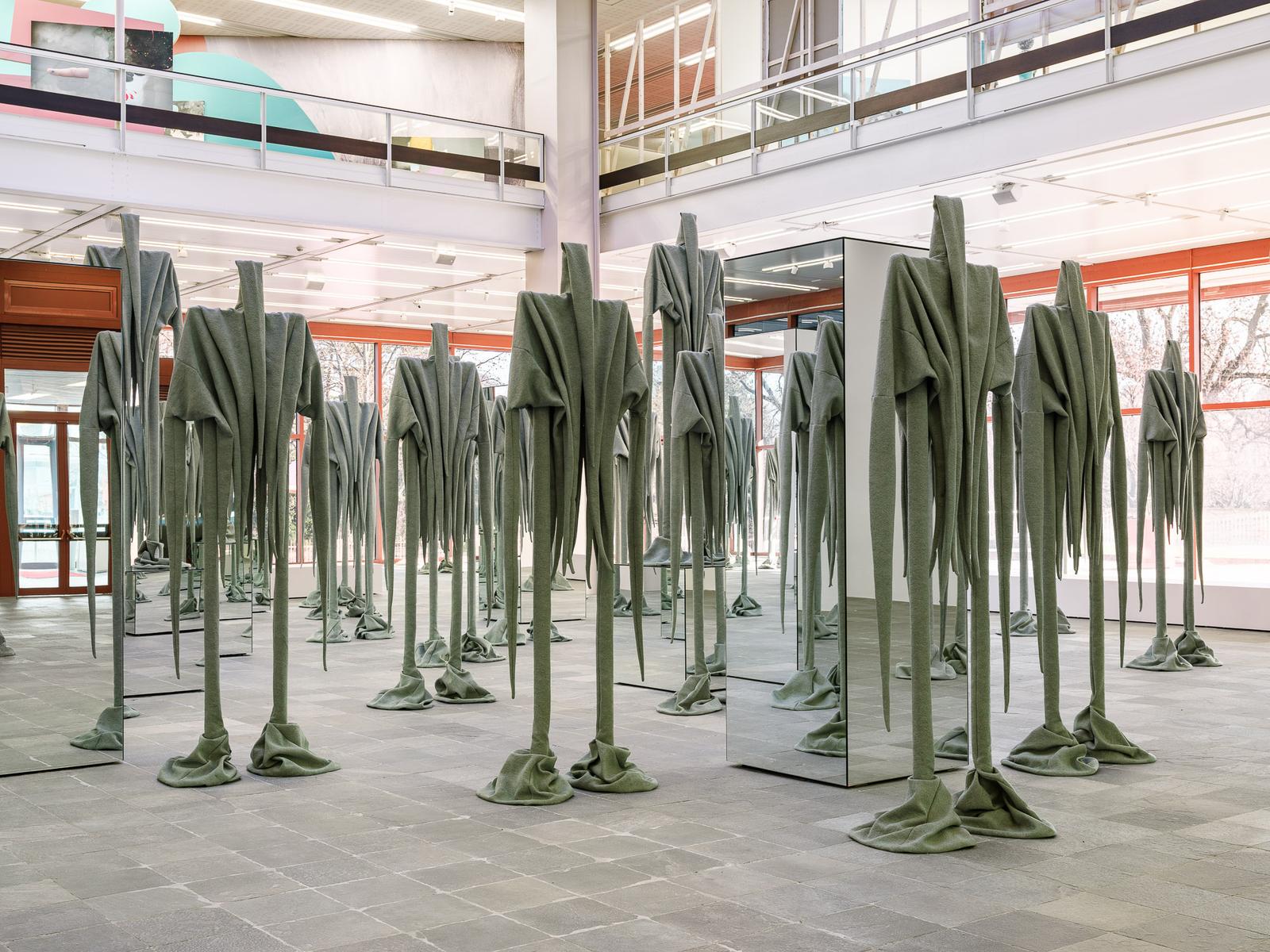 Barna rundt meg kommer vaktene i forkjøpet og bryter utstillingens regler ved å berøre skulpturene fysisk. Jeg forstår de små: De myke, men heller dystre kjempene er ganske riktig fristende å ta på. Utstillingen de opptrer i, heter da også «Skin to Skin». Med sine kroppslige, intime assosiasjoner gjør tittelen det nærliggende å kjenne på tekstilene de 55 skikkelsene som for tiden fyller Wien-institusjonen Belvedere 21, er skapt av.