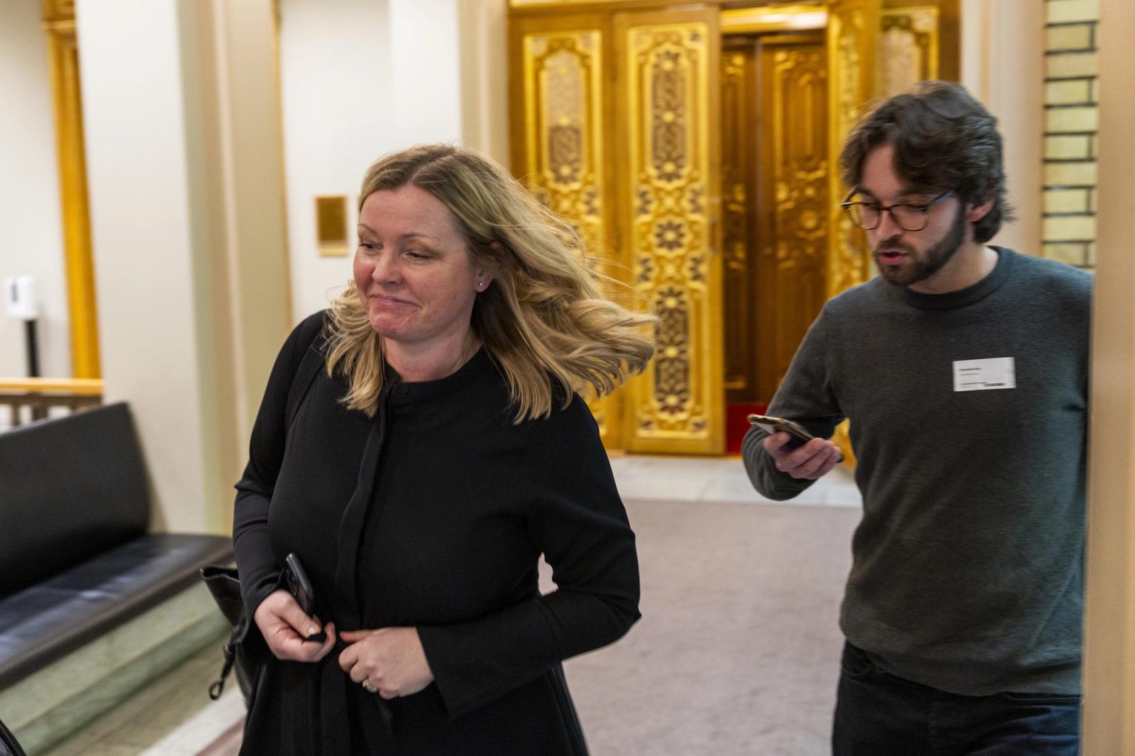 Uten å stanse haster arbeids- og inkluderingsminister Kjersti Stenseng (Ap) forbi da Klassekampen introduserer seg for henne i Vandrehallen, der politikerne vanligvis lar seg intervjue når de har vært i stortingssalen.