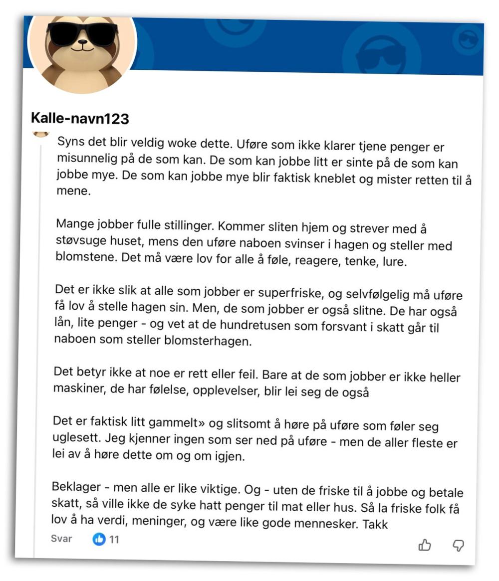 Også andre steder delte den anonyme brukeren friske meninger. En lengre kommentar argumenterte for at uføre må tåle at naboen sender lange blikk når de ser uføre «svinse» rundt i hagen.