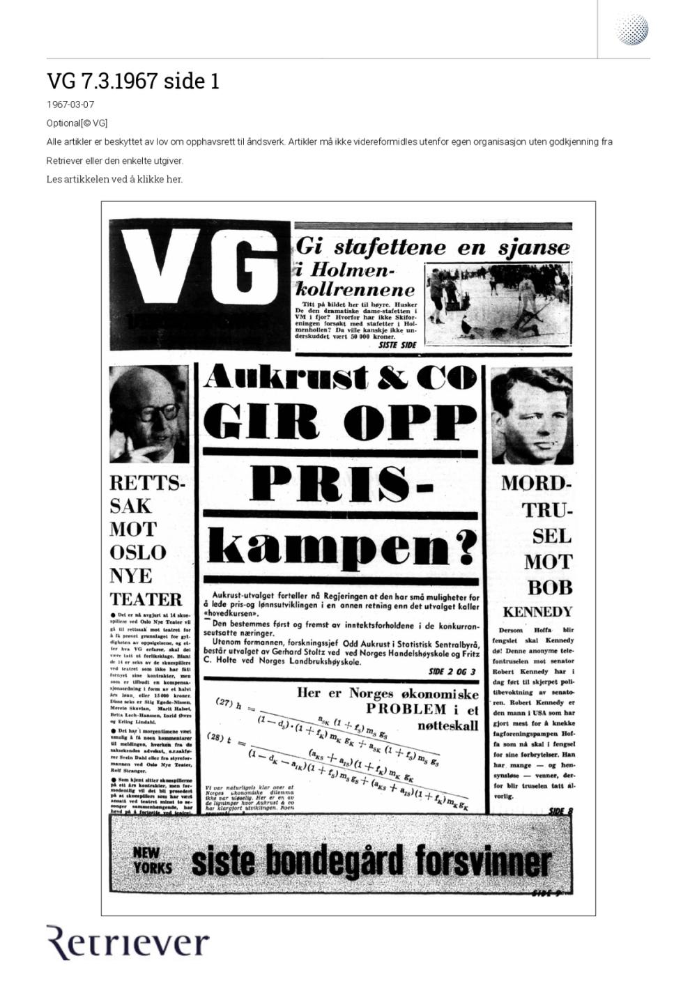 Dette var også dilemmaet man sto overfor da Odd Aukrust på 1960-tallet fikk i oppdrag å utrede hvordan man kan hindre at lønnsvekst bidrar til vedvarende prisvekst. Resultatet av det arbeidet ble frontfagsmodellen. Konklusjonen hans var imidlertid så oppsiktsvekkende at VG trykket den på forsiden i 1967: «Aukrust & Co gir opp priskampen?». Utvalget hevdet at det var «umulig å forene bestemte fordelingspolitiske mål med kravet om et stabilt prisnivå». Det regjeringen derimot burde bekymre seg for, var ikke den mye omtalte prisstabiliteten, men konkurranseevnen. «Prisoverveltning var uansett umulig å unngå. Målet måtte da ikke være å forsøke å hindre slik overveltning, men å hindre at lønnsnivået i konkurranseutsatt sektor ble for høyt», ifølge historikerne Eivind Thomassen og Lars Fredrik Øksendal.