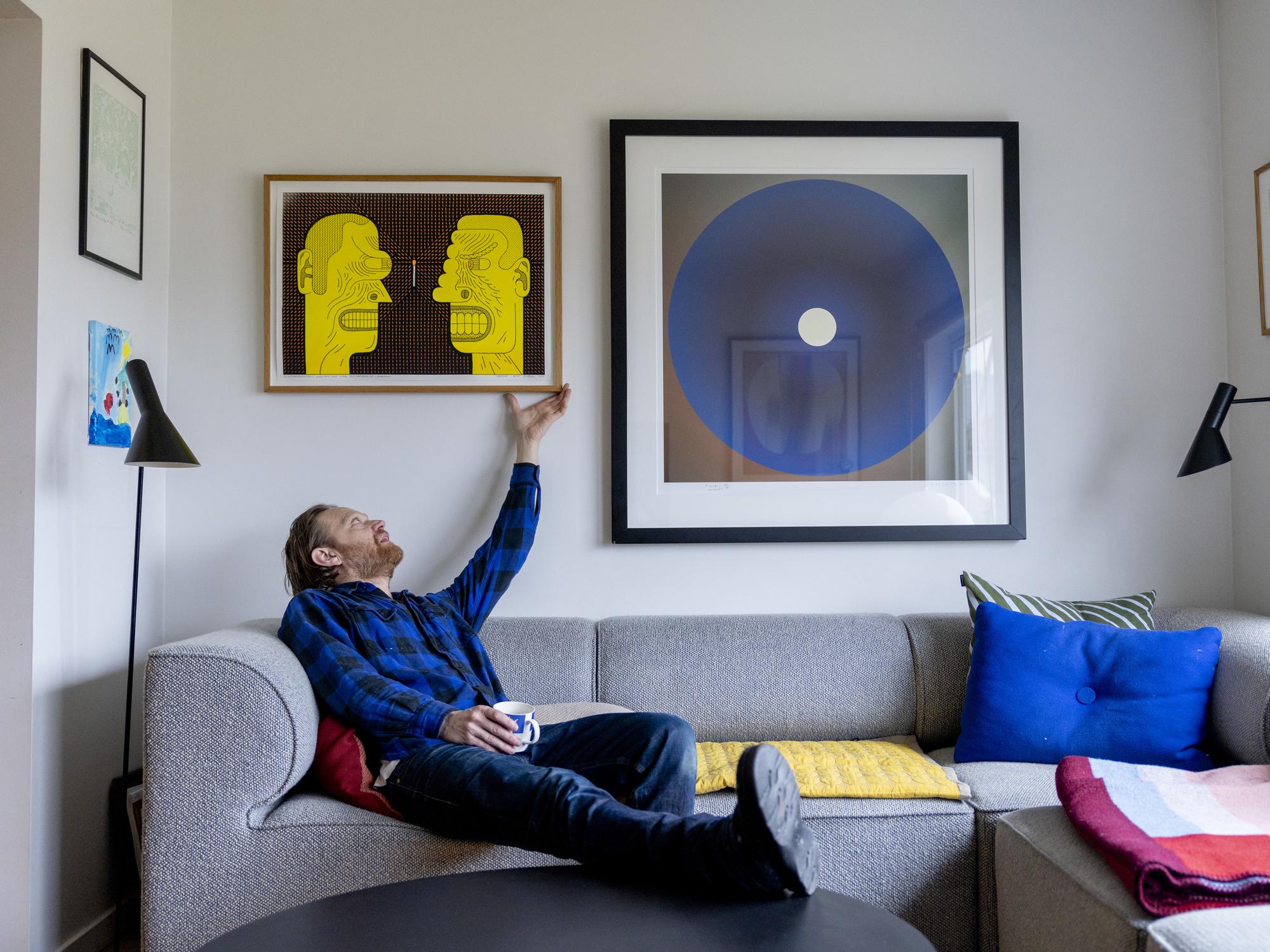 På veggen liker Flu Hartberg å ha kunstverk som er mindre masete enn hans egne tegninger.