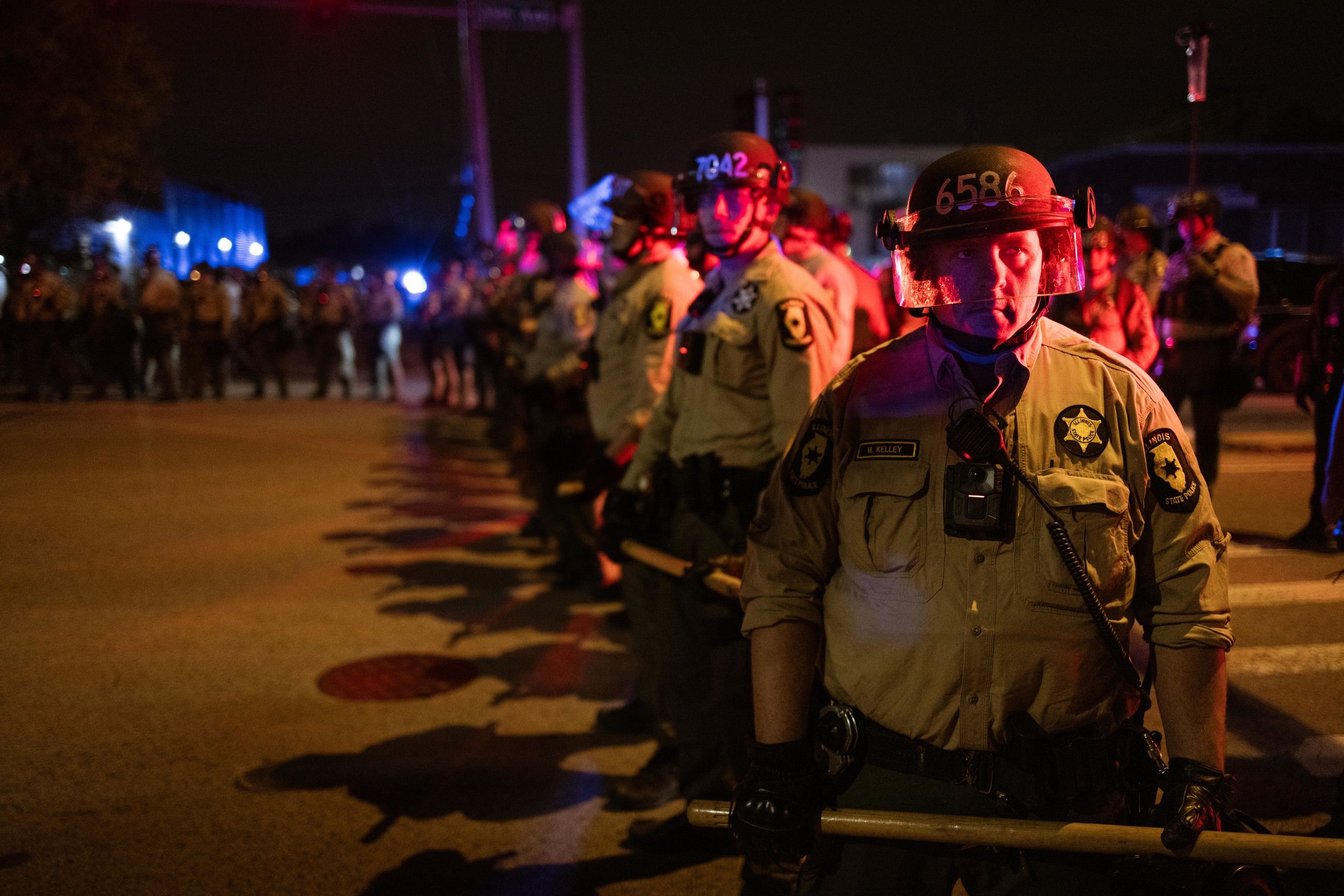 Utenfor Ice-hovedkvarteret i Chicago barker venstreaktivister sammen med et aggressivt opprørspoliti