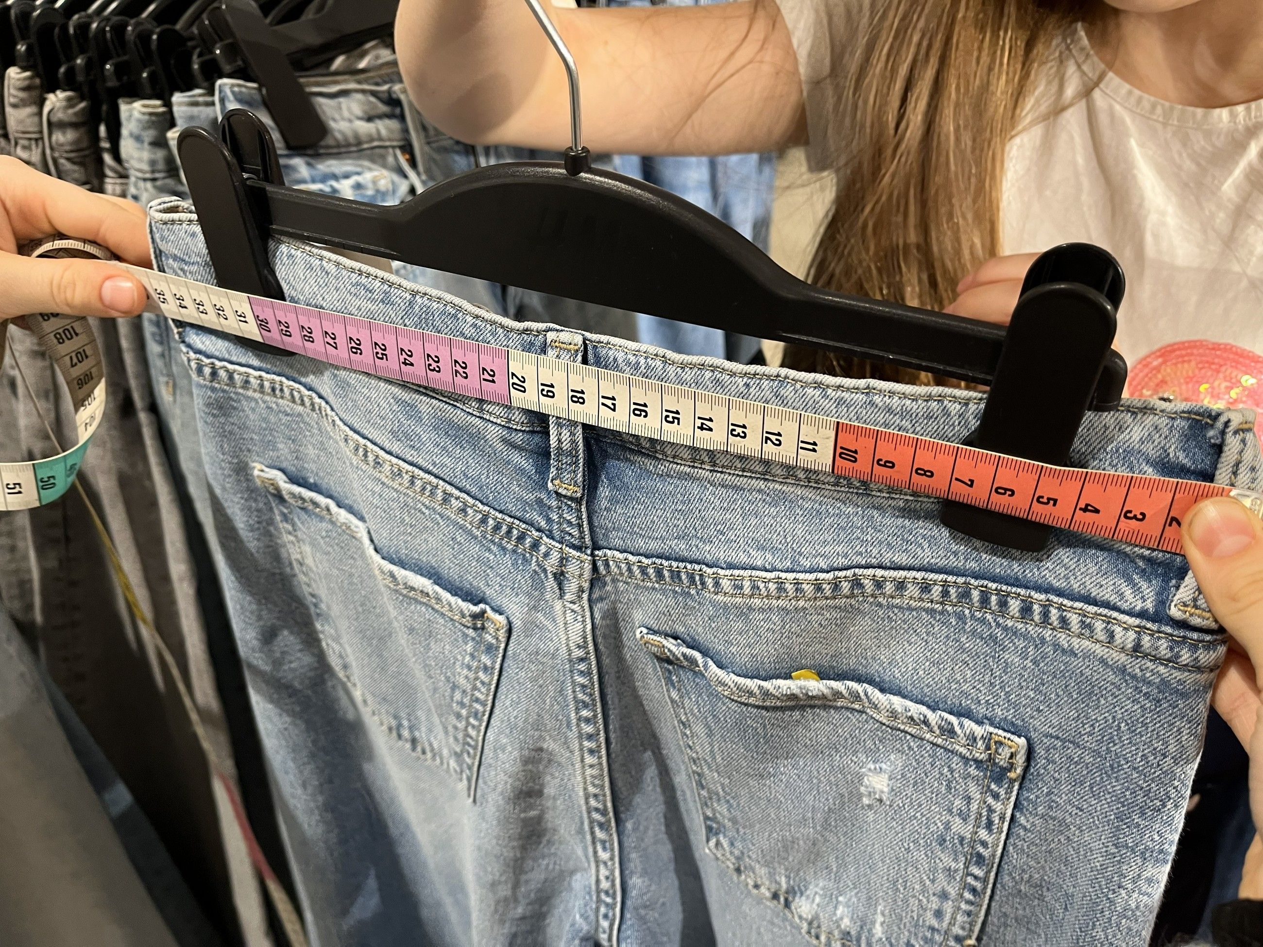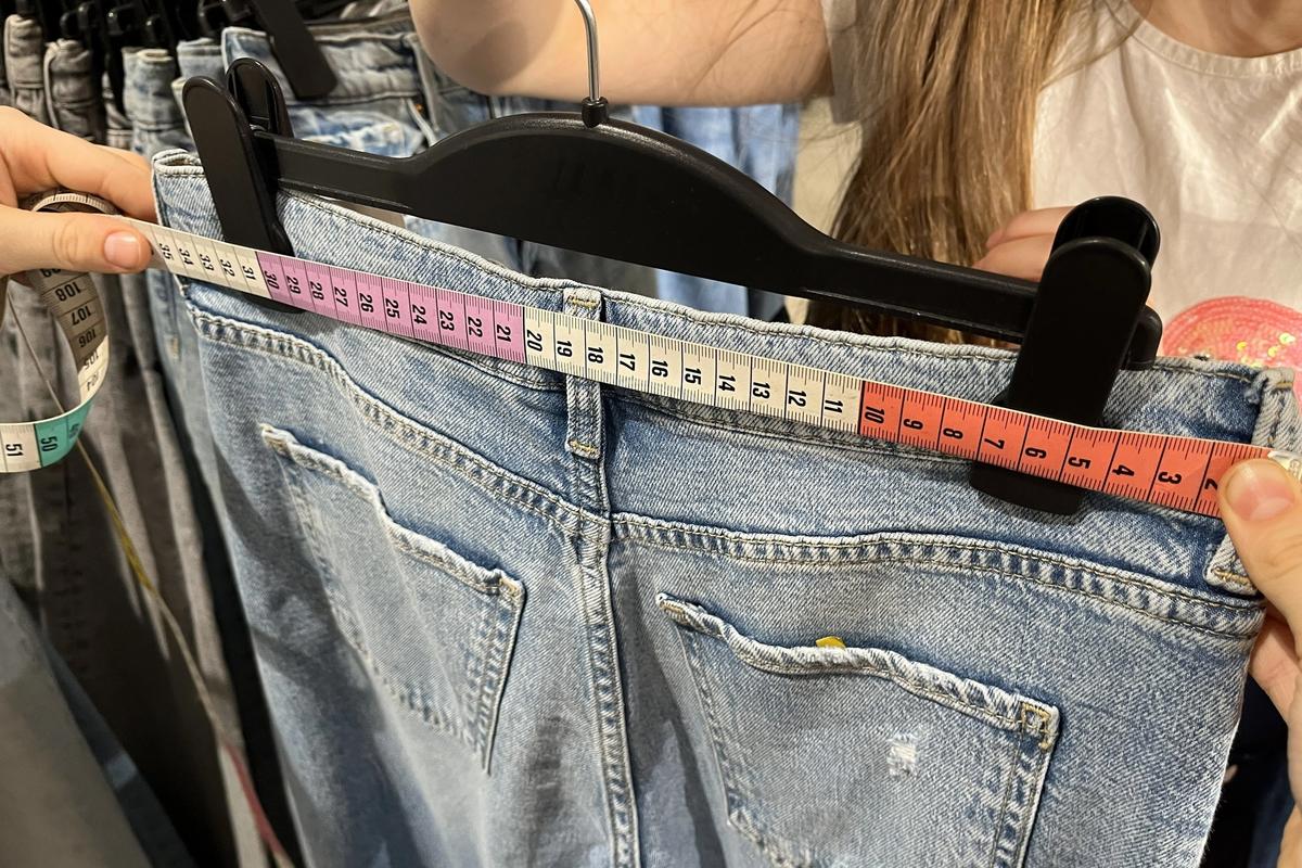 Hvorfor øker jentebukser i lengden, men ikke i bredden? Jeg tok med meg to tenåringer på Trondheim Torg med målebånd.