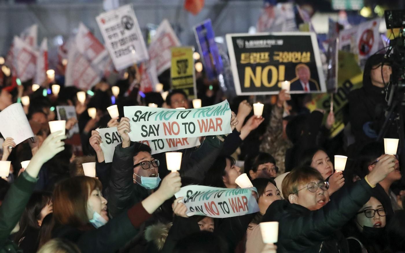 Krigskoreografien skal ikke være til å misforstå: Idet Air Force One lander på flybasen Osan utenfor Seoul, glir de amerikanske hangarskipene USS Nimitz, USS Ronald Reagan og USS Theodore Roosevelt med kurs for Japanhavet for nok en militærøvelse, med den japanske destroyeren JDS Inazuma på slep.