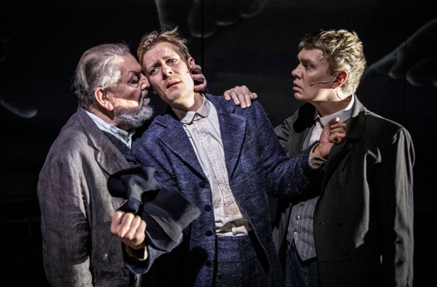 GODT SPILL: Forestillingen fungerer best når Preben Hodneland (midten) bærer scenen på egen hånd. Her er han sammen med Jørgen Wiig Salvesen og Sverre Bentzen. FOTO: ERIK BERG, RIKSTEATRET