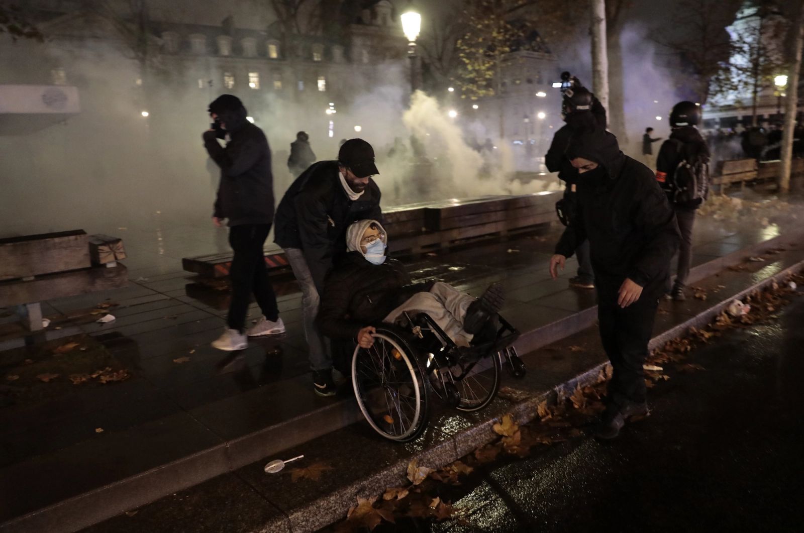 En demonstrant i rullestol prøver å komme seg unna gateslaget i Paris lørdag, idet det bryter ut voldsomme sammenstøt mellom politi og aktivister som protesterer mot president Emmanuel Macrons omstridte sikkerhetslov. YS