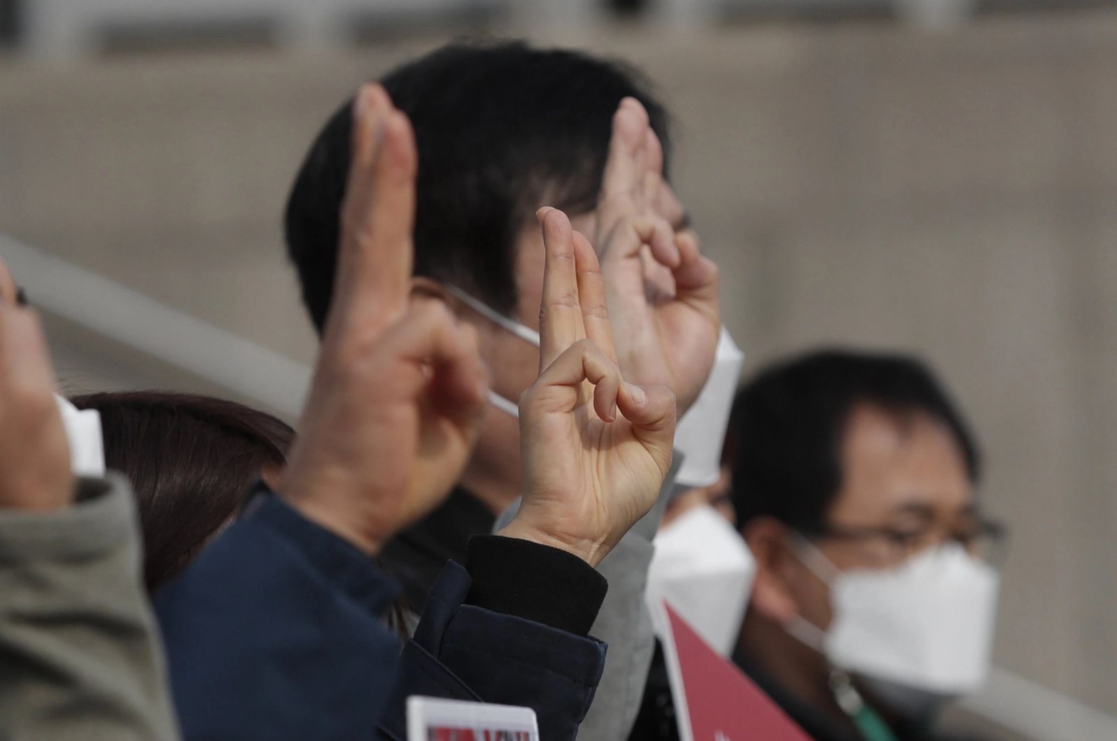 Sørkoreanske fagforeningsaktivister i Seoul markerer med tre fingre sin støtte til Myanmars generalstreik mot militærkuppet. Søndag ble 44 demonstranter drept i Myanmar – det høyeste tallet til nå – og i går møtte landets avsatte leder Aung San Suu Kyi til retten, tiltalt blant annet for å ha oppildnet til uro. LE