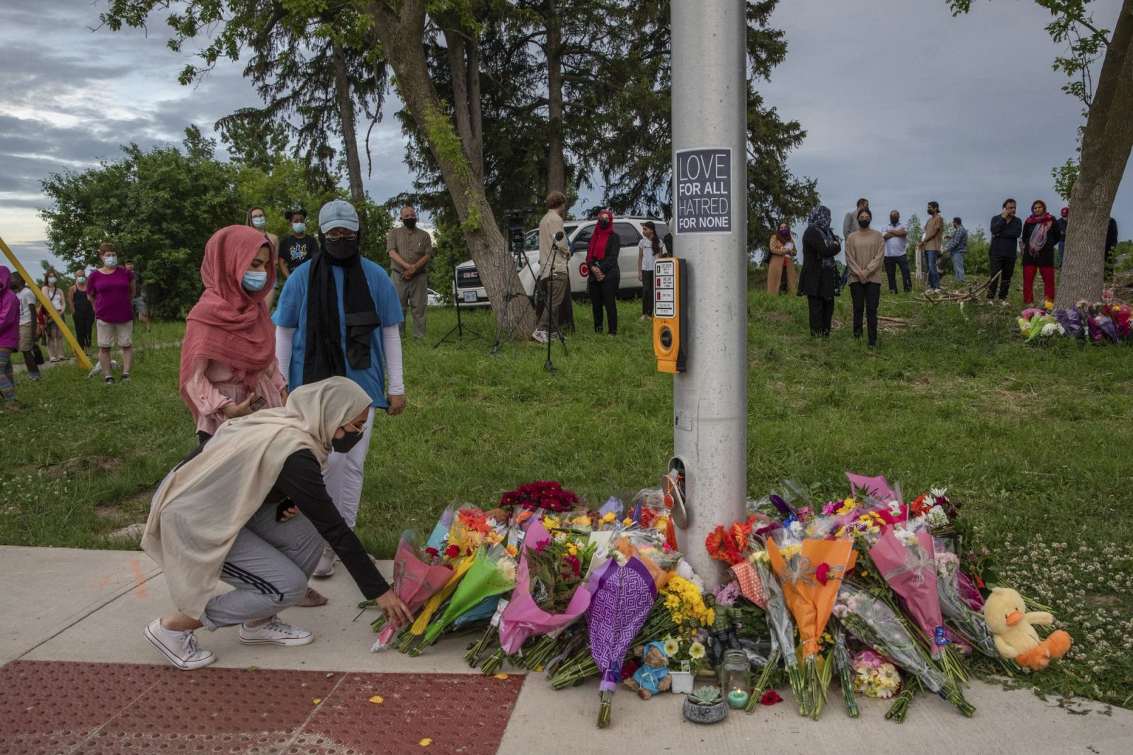 Sørgende kom med blomster til åstedet der en familie på fem ble angrepet av en mann i en pickup søndag i London i Ontario. Fire av familiemedlemmene døde, og tilstanden til det siste er kritisk. Den 20 år gamle sjåføren hadde bevisst kjørt på familien fordi de var muslimer, ifølge kanadisk politi. Han er nå siktet for fire drap og et drapsforsøk.