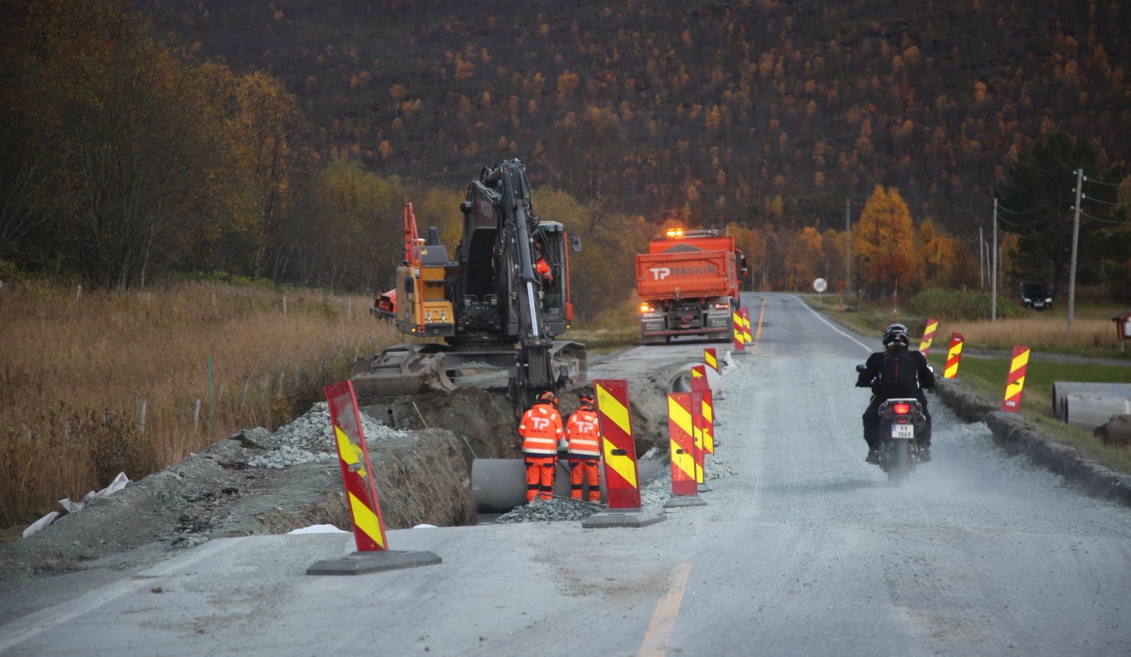 I Storfjord i Troms er E6 gravd over. Fra stikkrenna under veien hentes et gammelt stålrør opp og erstattes med et betongrør med større dimensjon. Trafikken er lysregulert forbi og venter tålmodig.