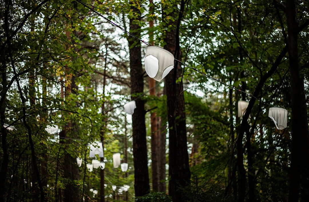 På avstand kan de se ut som om de svever fritt. Straks man kommer nærmere, ser man at de lykt-lignende gjenstandene er festet i kabler som strekker seg mellom trærne. Først og fremst oppdager man hva slags objekter det er tale om: underbukser – en enorm mengde av dem.