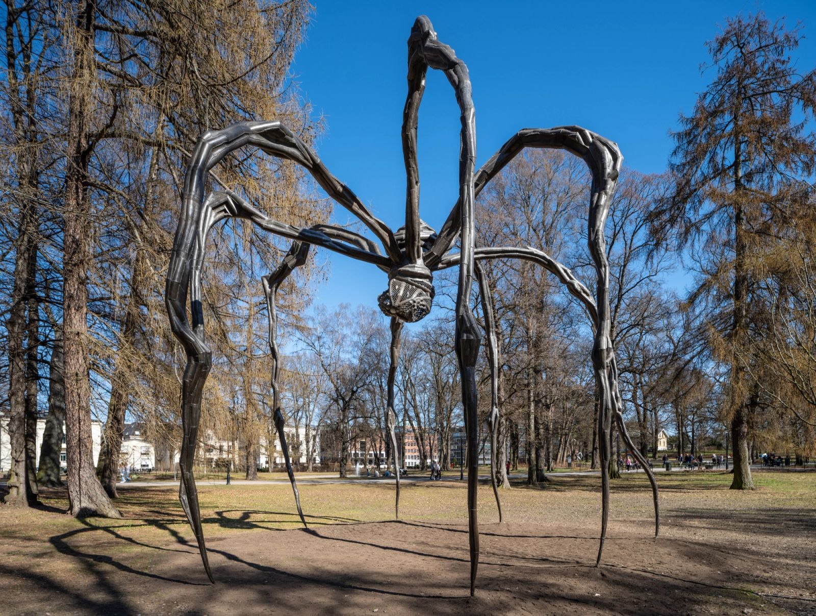 På avstand er det vanskelig å skille skapningen fra formene rundt den: Den ruvende edderkoppen av marmor, bronse og stål går tilsynelatende i ett med landskapet den er plassert i. De åtte bena ligner de høye trærne og lange grenene som omgir dem. Straks man kommer nærmere, derimot, trer den tydelig frem: Louise Bourgeois’ (1911–2010) rovdyr fra 1999 er så stort at det danner et omfangsrikt rom folk kan vandre inn i. Når man står i det, ser man at skapningens avrundede ben rammer inn slottet like bortenfor. Tittelen gir den nærmere ti meter høye skulpturen en ladning som er like deler vennlig og dyster: Med giften sin truer og beskytter «Maman» på samme tid.