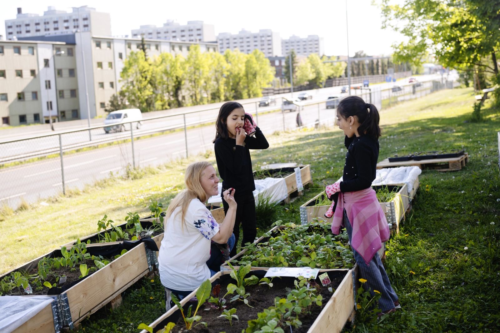 Det hvite huset ligger rett ved en trafikkert motorvei. Det er bare et nettinggjerde som skiller dem. Men beboerne i dette strøket ved Veitvet i Oslo lar seg ikke forstyrre av bilduren mens de planter på den lille gressplenen utenfor Sletteløkka grendehus.