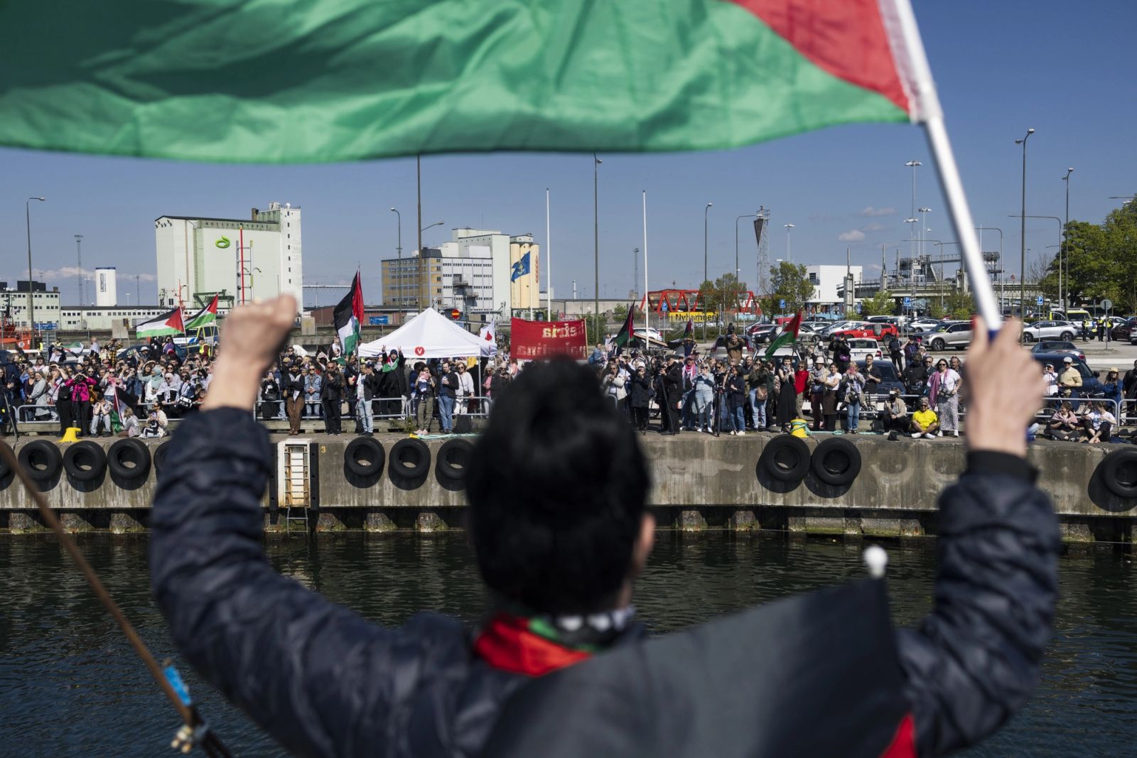 Shukran, shukran, habibi! Takk, roper Jeanette Escanilla på arabisk og vinker fra båten Handala idet den legger fra kai i Helsingborg. Skuta ble dekorert kvelden i forveien med nye malerier. Den er et fargerikt og politisk skue der den tøffer ut fra havna. Små og store palestinske flagg vaier fra master og rekkverk.