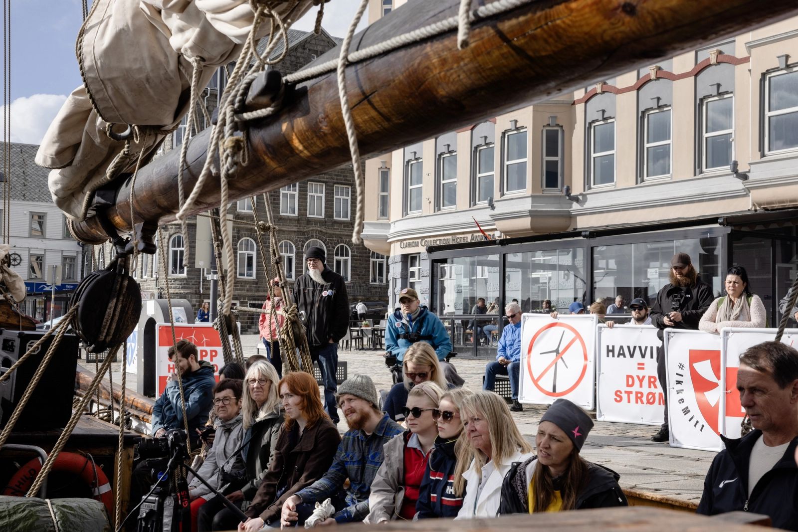 Rødt-nestleder Sofie Marhaug var eneste motstander av havvind i panelet da Klassekampen debatterte det som blir beskrevet vekselvis som Norges nye industrieventyr og del av løsningen på klimakrisa. Men Marhaug hadde Motvind, organisasjonen mot vindkraft, i ryggen. Bjarne Jensen, som leder havvindutvalget i Motvind, hilser hyggelig før debatten og stiller spørsmål til panelet når det åpnes for det. Langs kaikanten har aktivister satt opp plakater og deler ut buttons og klistremerker mot vindkraft.