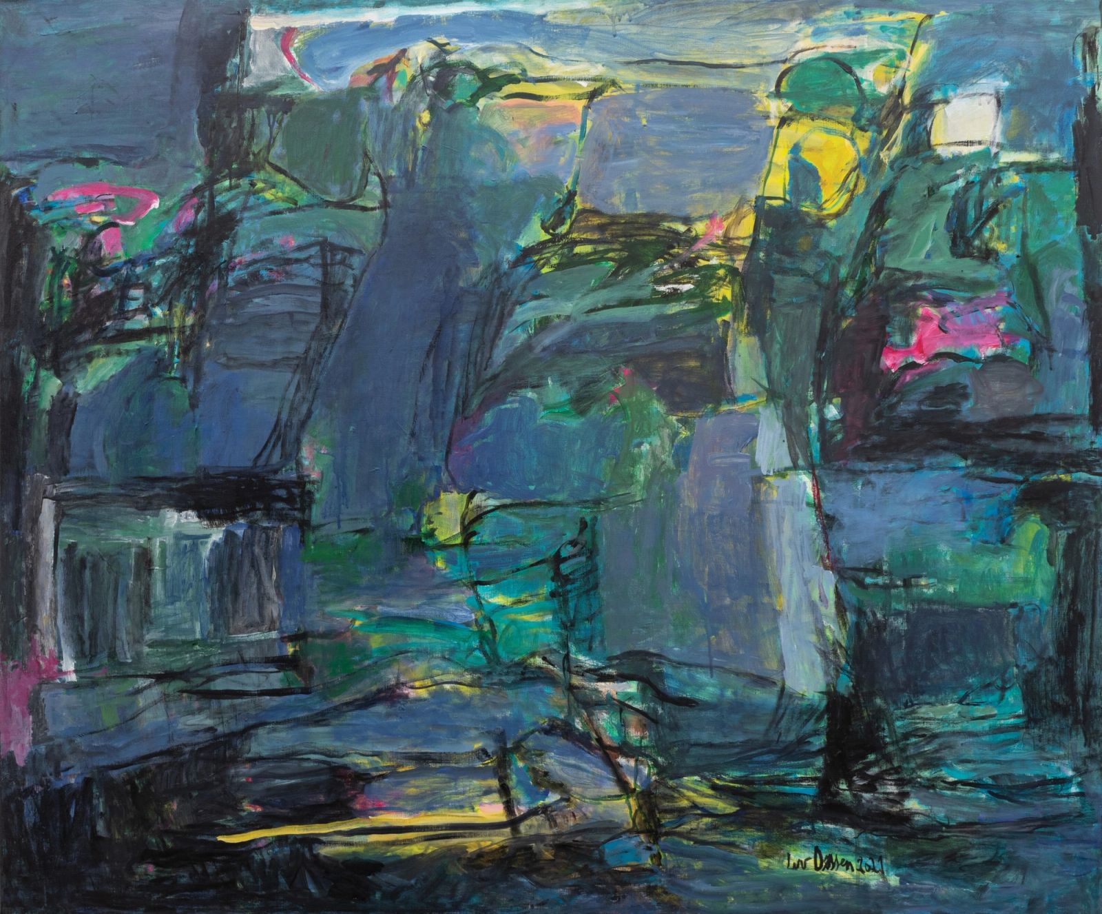 16. mars. Over ser du «Dikt i morgenlys» (2021) (akryl på lerret, 100x100 cm).