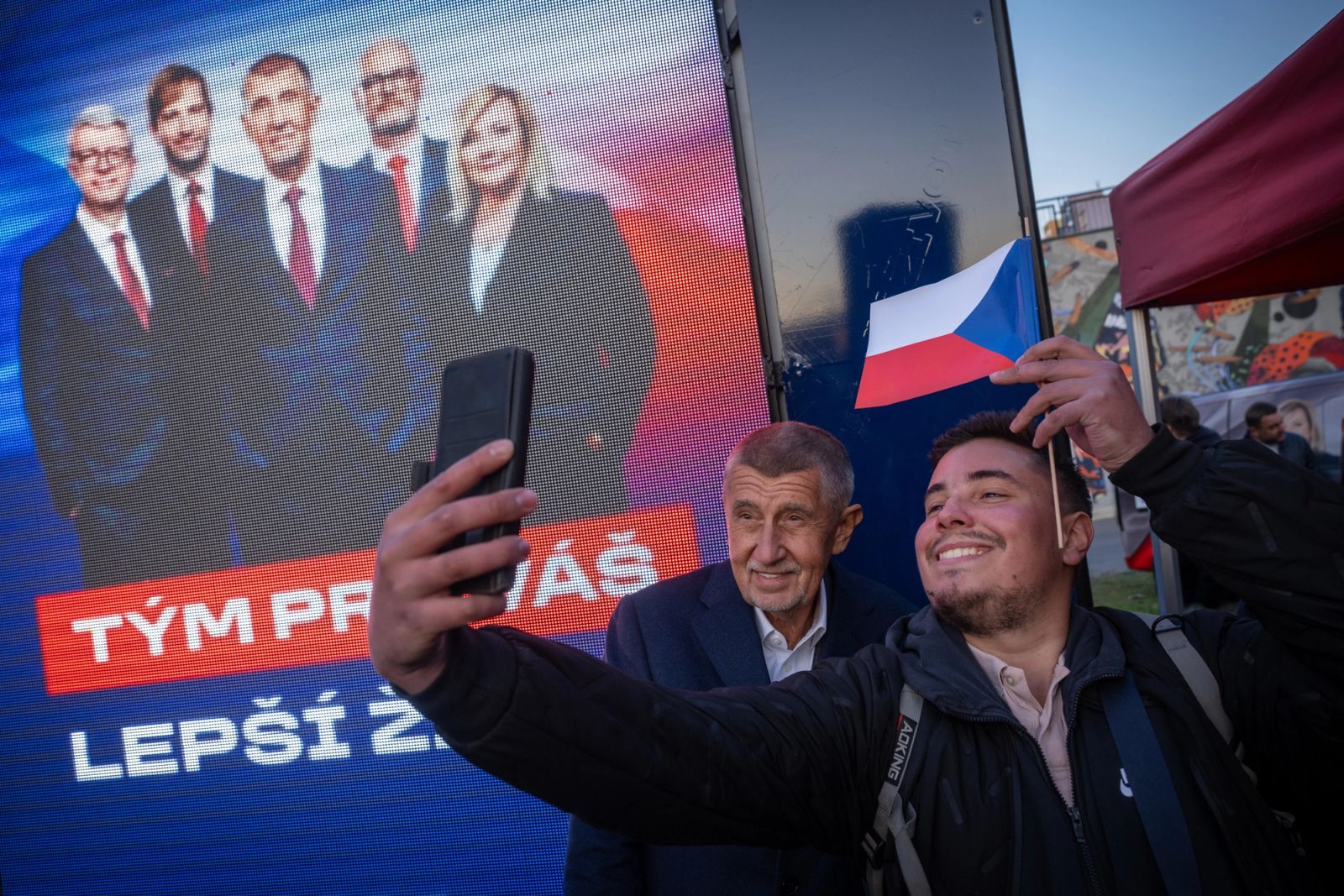 Andrej Babiš vinker mot publikum som har samlet seg i en park i forstaden Opatov, en mil sør for sentrum av Praha. Det er den tsjekkiske valgkampens siste dag, og mange av tilhørerne har iført seg en rød kaps.